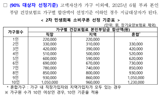 소득 하위 90% 여부는 가구원 수별 건강보험료 본인부담금 합산액으로 판단합니다. (장기요양보험료 제외)