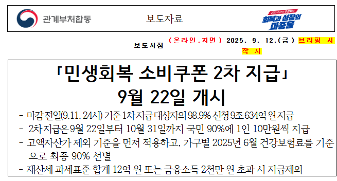 2025년 9월 22일부터 시작되는 2차 민생회복 지원금(민생회복 소비쿠폰) 은 전국민의 90%를 대상으로 지급됩니다. 이번 2차 지원은 1차 지급과 달리 소득 하위 90% 선별 지급 방식이 적용되며, 지급 기준은 건강보험료와 고액자산 보유 여부에 따라 달라집니다. 아래에서 구체적인 대상자 선정 기준과 신청 방법을 정리했습니다.