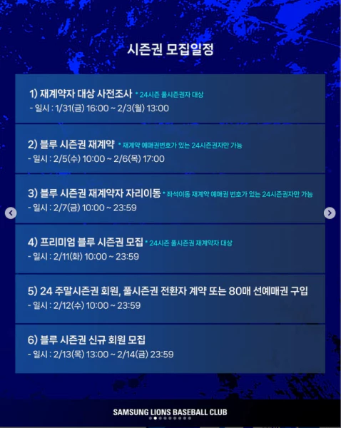 - 2) 블루 시즌권 재계약: 2/5(10:00) ~ 2/6(17:00)