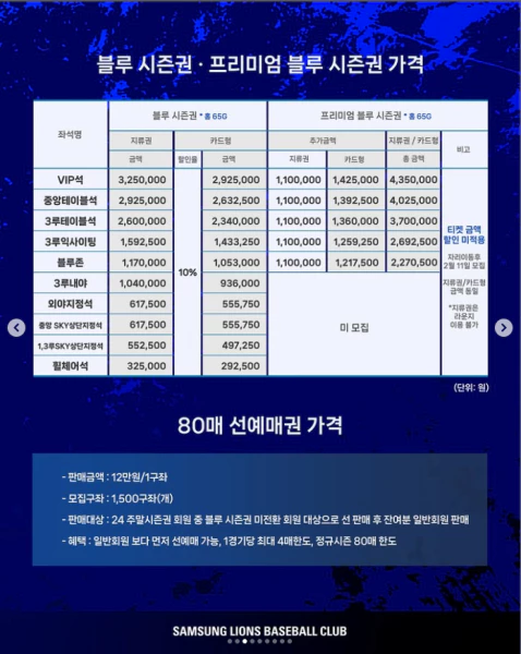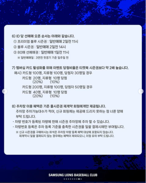 - 80매 선예매권: 80매 선예매권은 기존 블루 시즌권 회원에게 우선 제공됩니다.