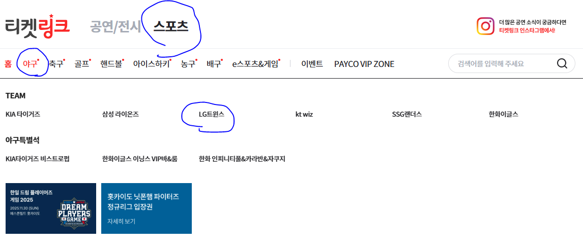 - 메인 화면에서 상단 메뉴 중 스포츠 → 야구 → LG트윈스를 클릭합니다.