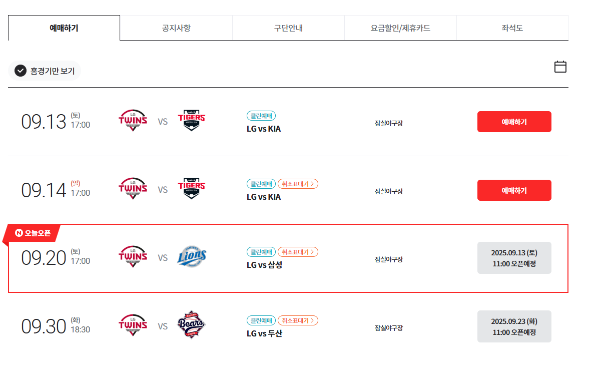 - 예매 오픈 시간 체크: 보통 경기 1주일 전 오전 11시에 예매가 열립니다.